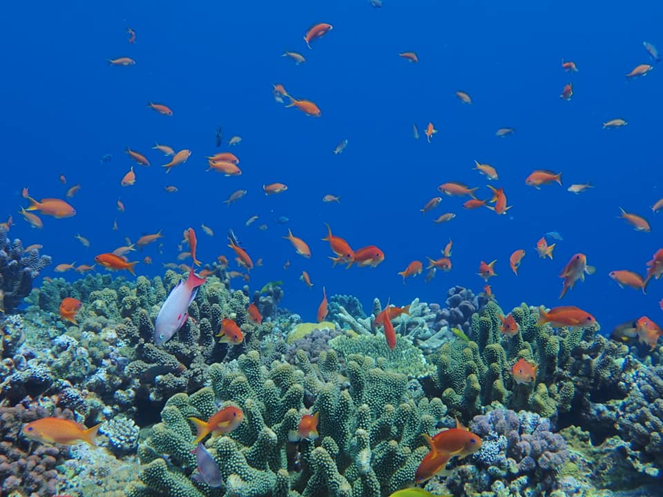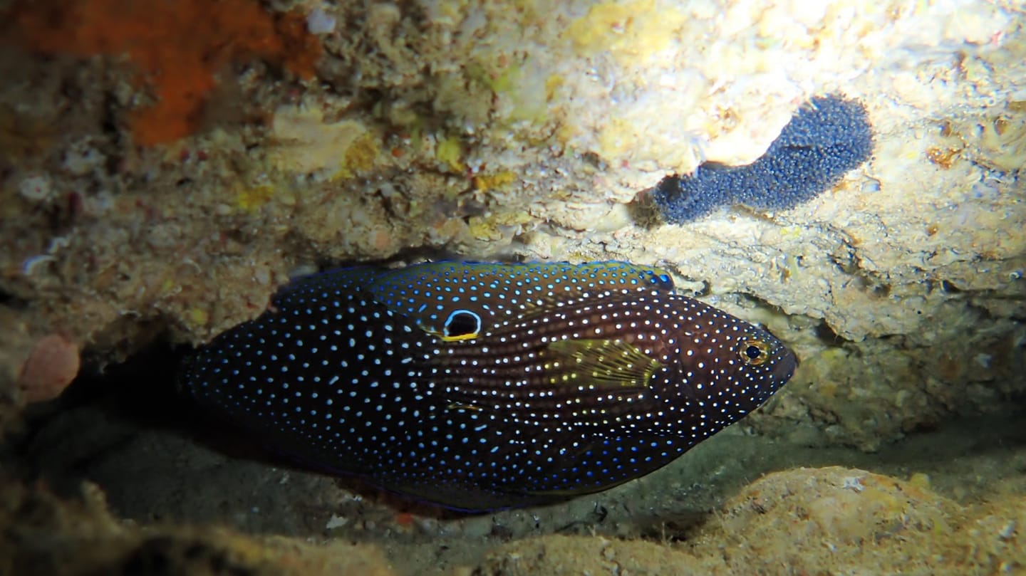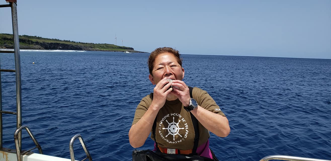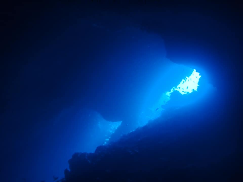この日は地形ポイント三昧で4DIVEでした。洞窟の中に光が差して、いつ見ても感動します。船の上で食べるポークタマゴおにぎりもサイコーです。狭い穴の中、シモフリタナバタウオが卵を守っていました。