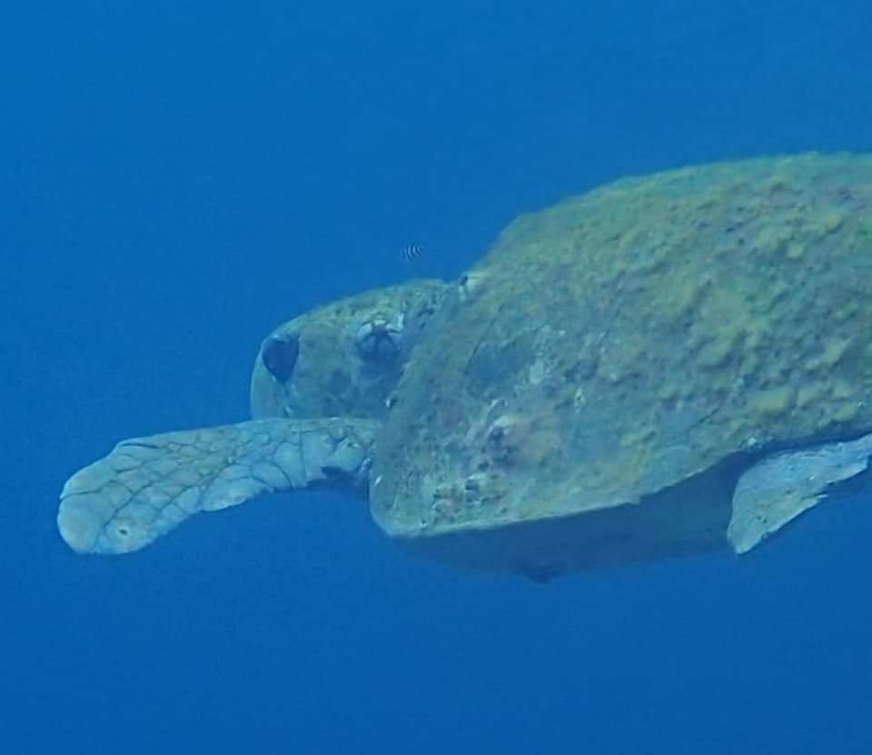 「もう上がるよ~。」とボーっと仲間を見ていたら、いきなりアカウミガメに顔を覗き込まれました。超ビックリ!!あわててカメラを向けましたがうまく撮れず。しかしまあ~、目の後ろのフジツボといい背中の藻といい、アカくん、かなり気合い入ってます。