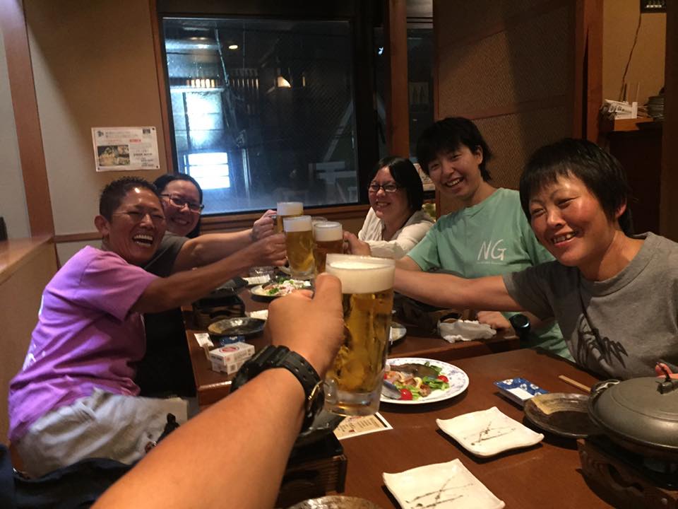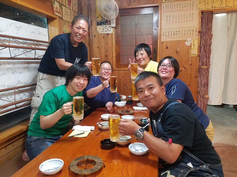 途中、温泉に寄って21:00過ぎに打ち上げ場所の「だるま」へ。