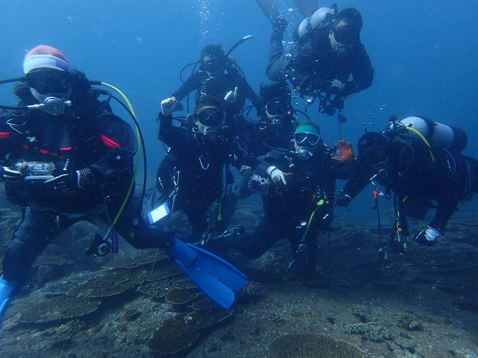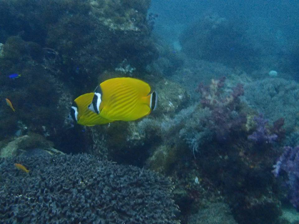 水中は雨のせいで若干暗めでしたが、みごとなソフトコーラルの群生やイサキの超~大群、でかいマダラエイ、コブダイなどなどが出迎えてくれてみんな大興奮。