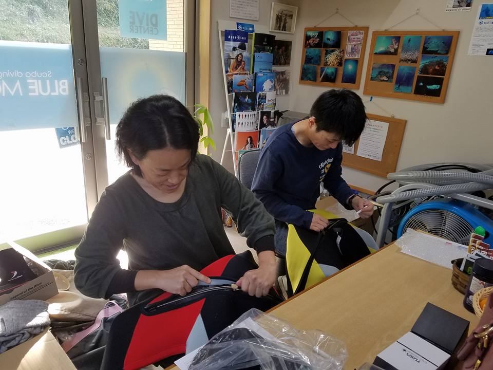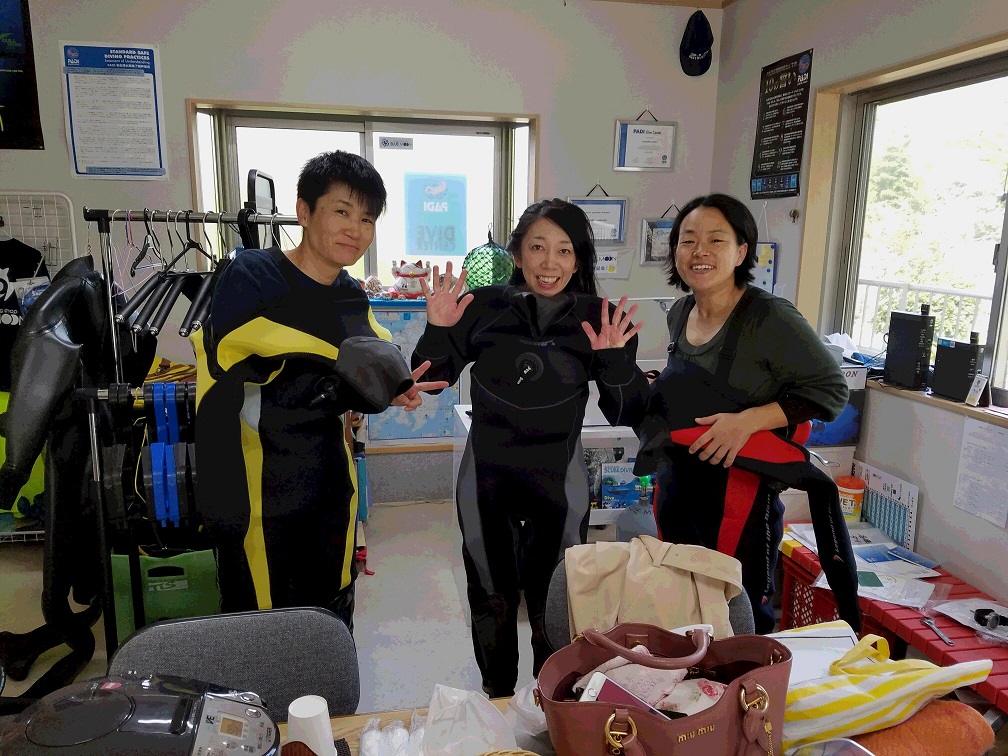 これからのシーズン、身体が濡れずに済むドライスーツが快適です。すでにダイバーのTさんを含め、ドライスーツの扱い方や着方等々を覚えて頂きました。ファスナー処置ひとつにしても、ちゃんとした取り扱いが今後の快適なダイビングにつながります。