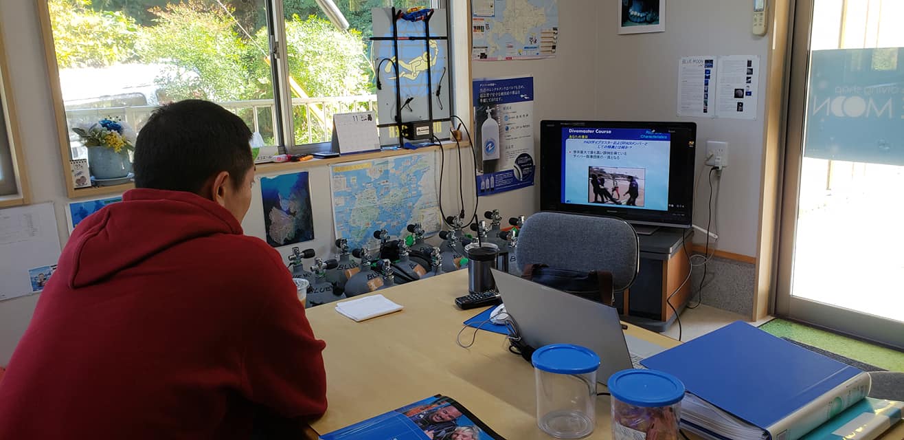 H君がBLUE MOONにやって来たのは、ショップをオープンして数ヶ月経った頃でした。オープンウォーター(初心者)講習、アドバンス講習、レスキュー講習を経て、昨年、アマチュア最高峰のマスタースキューバダイバーに。とんとん拍子でここまで来たBLUE MOON生粋のダイバーです。そしてH君、もうすぐ100DIVE を迎えます。よくここまで頑張ったなーとDVDを観る後ろ姿をほほえましく思うのでありました。