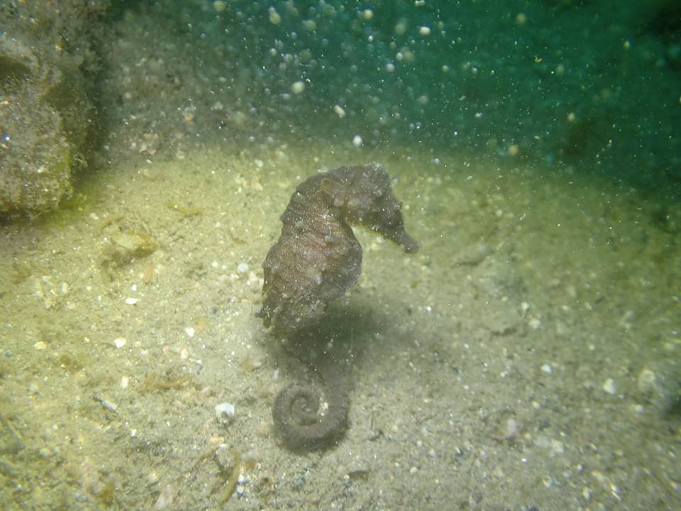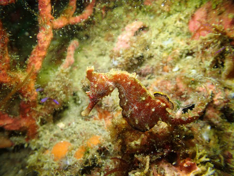 カメラ持ってじっくり観察すると、ここにもいたんですねー!単体ですがタツノオトシゴです。カメラを向けるとフラフラと、まるでニャンコのように自由気ままに泳いでました。(気づいたらカメラのハウジングが曇っており…。)