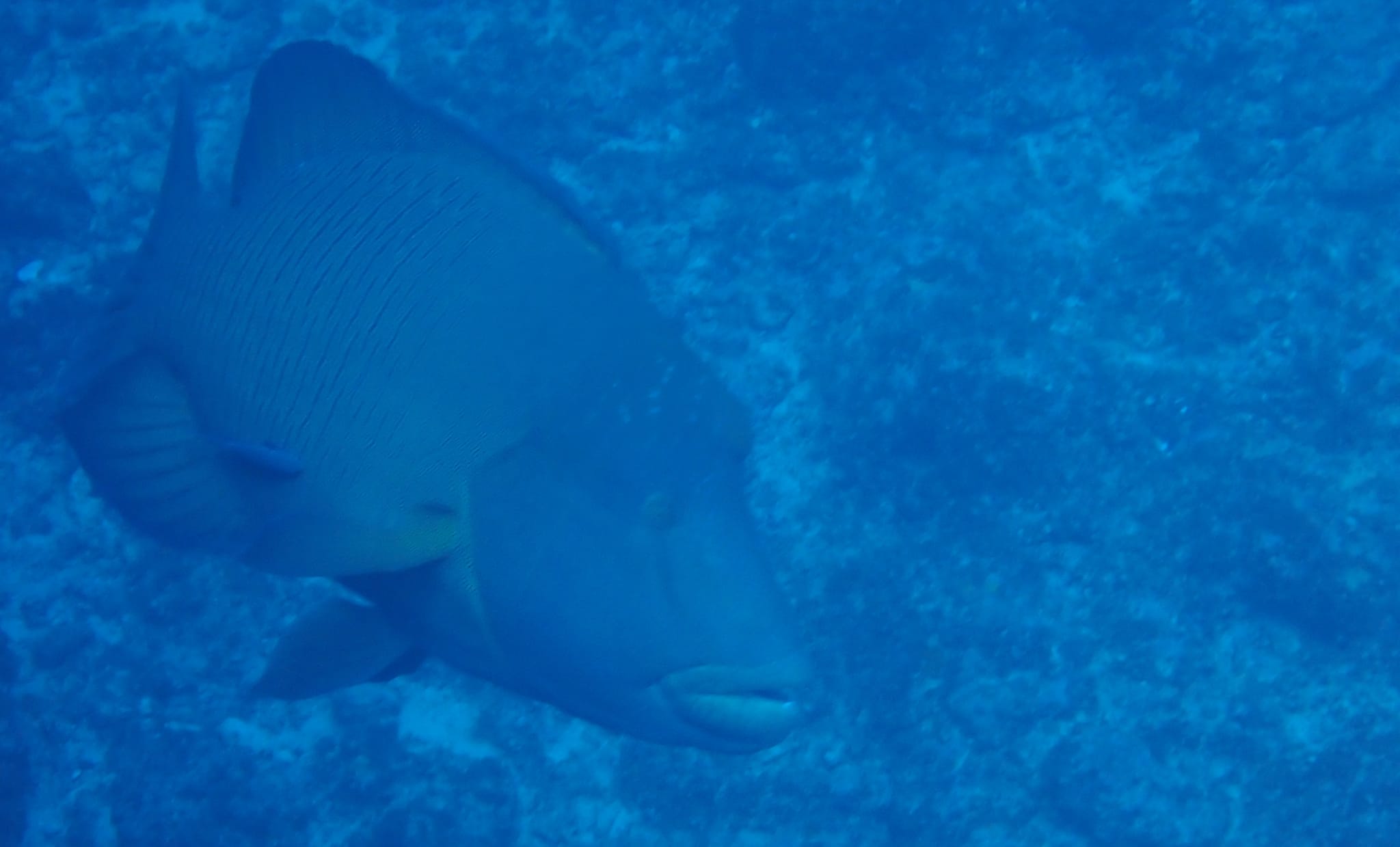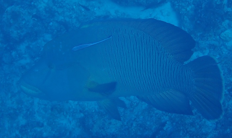 「釣り場西」は地形と大物ポイント。何が現れるかいつもワクワクです。今回はメチャでかいナポレオンがぬ~っと出現。