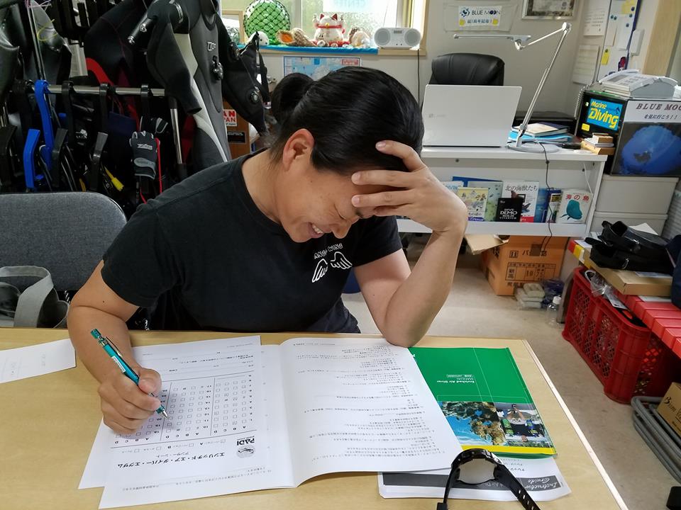 土日は海洋なしで、Hさんのエンリッチド・エア・ナイトロックス(EANx)学科講習でした。テストで頭かかえてる写真ですが(やらせ?笑)、全く余裕での合格でした。口元笑ってるし(笑)!まずはおめでとうございます!EANxの世界へようこそ!次回のダイビングからバンバンEANxで潜りましょ~♪