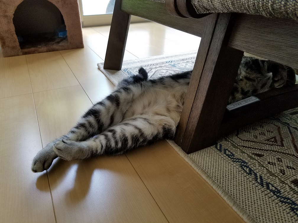 で、みんなが帰ったらソファーの下でこの様子。掃除機かけても起きませんでした。ドライヤー体験は、びびりなトトを少し強くしたようです(笑)。
