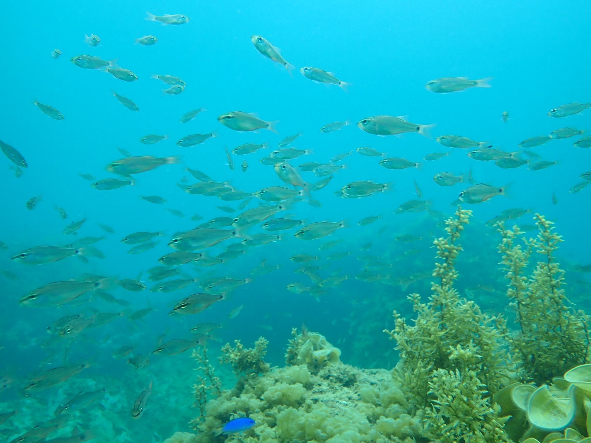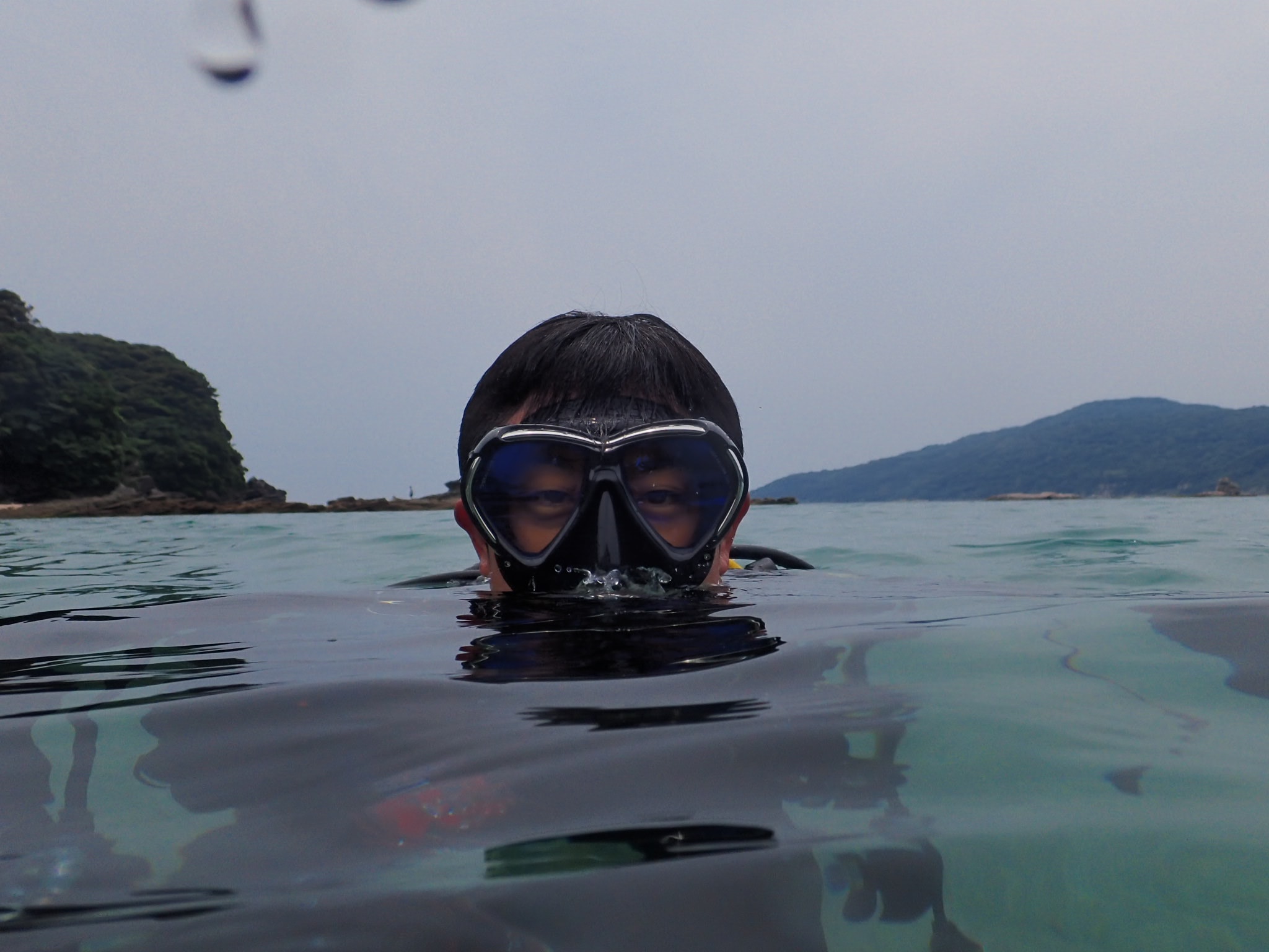 気温27℃、水温23℃、透視度11m(左)と15m(右)、ベタ凪。ドライスーツのインナーは薄手のものでオッケーです。グローブもフードも必要なし。もうすぐウェットスーツでも大丈夫かな?