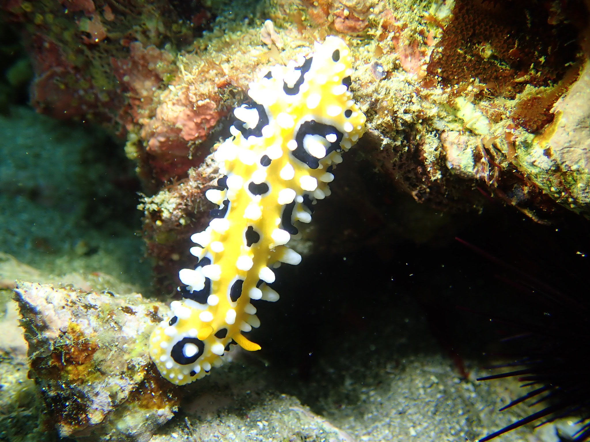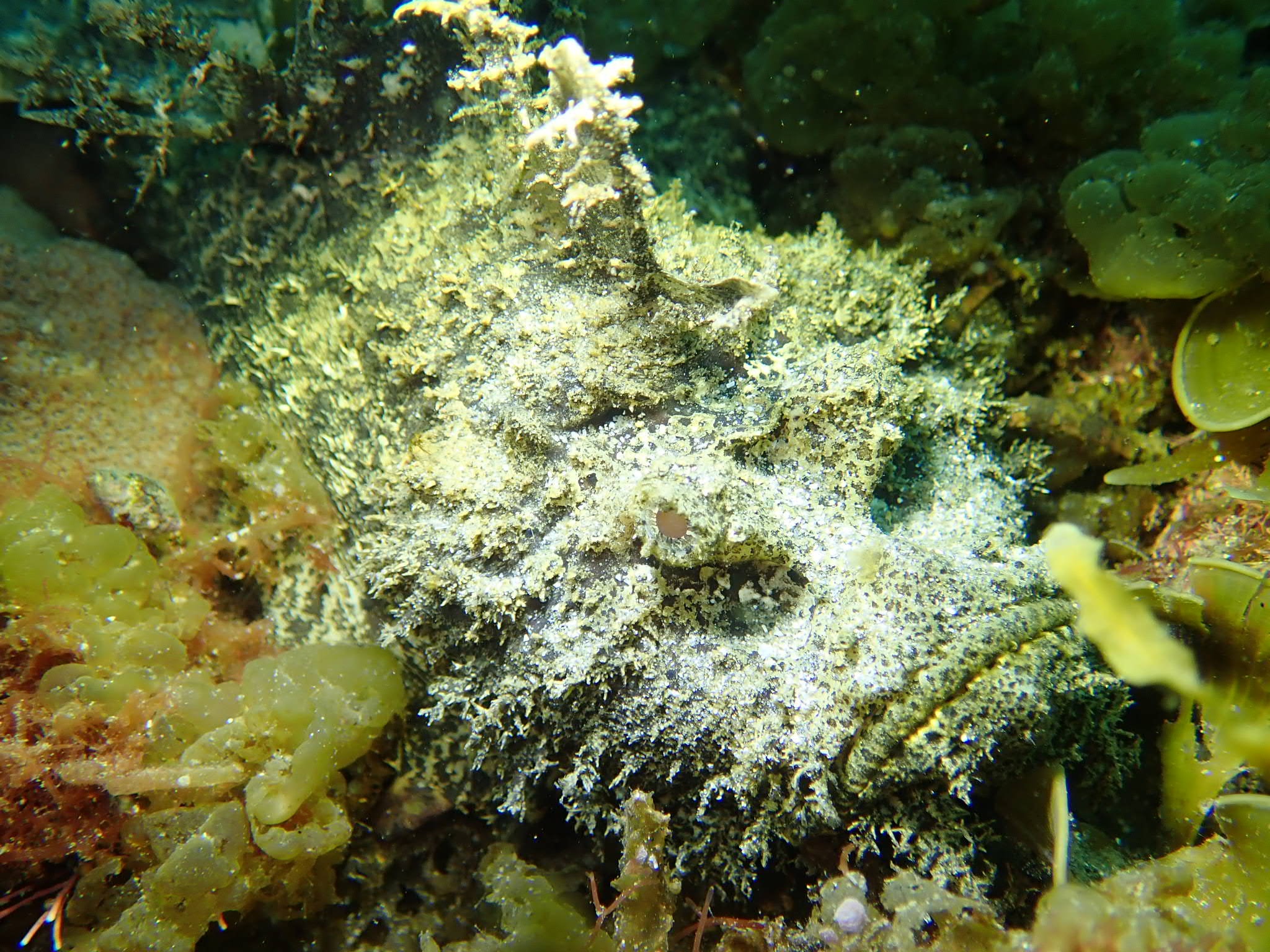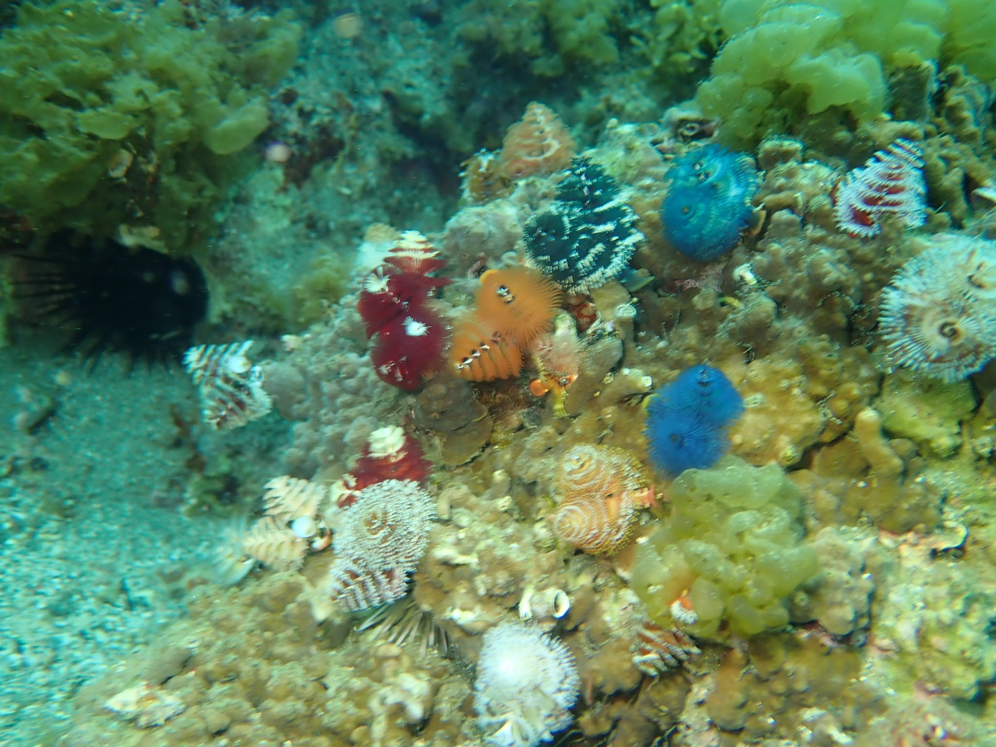 右ポイントの水中の様子です。左ポイントに比べると生物が豊富で、色とりどりのイバラカンザシをあちこちで見かけます。普通近寄ったらスッと引っ込んでしまうのに、結構近づいて撮影できます。ウミウシも結構見かけました。ダルマオコゼはよく見たら人面魚(笑)!ミナミハコフグの幼魚や石鯛の子供も遊びに来てくれました。