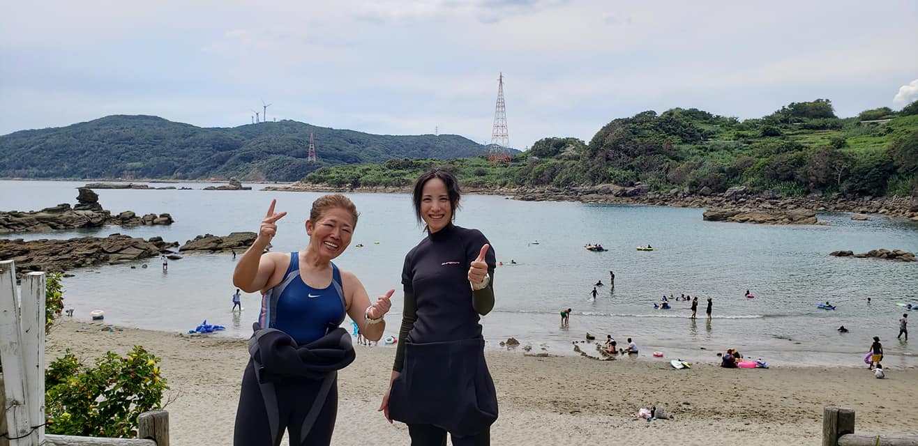 学校は夏休みに入り4連休も重なって、いきなり賑やかな海になっていました。水温は26℃となり5㎜のワンピースで十分です。