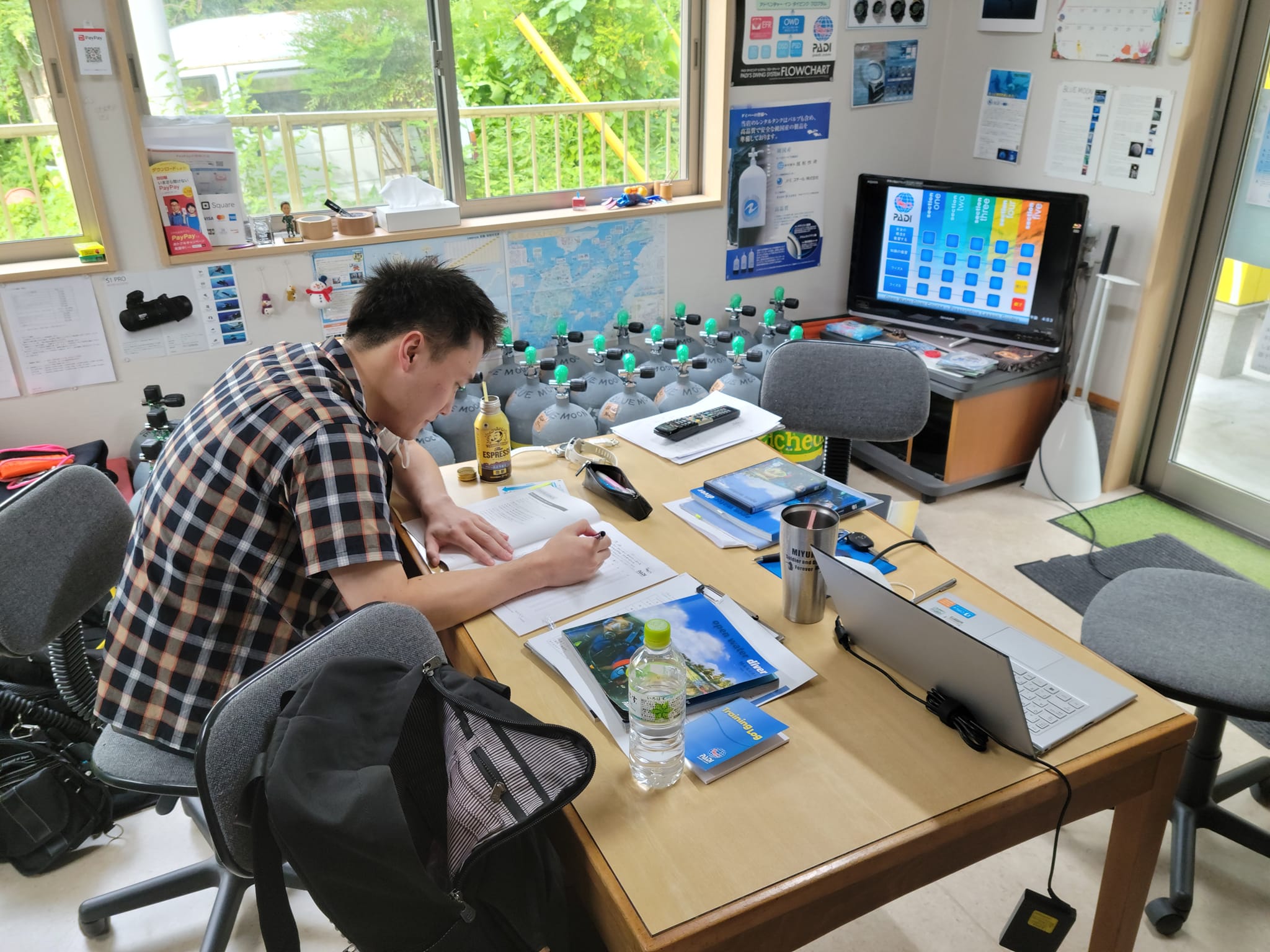 この日はオープンウォーター(初心者)学科講習。なんとBLUE MOONでは久々の男子がエントリーです!!うちは女子率高いですからねー。