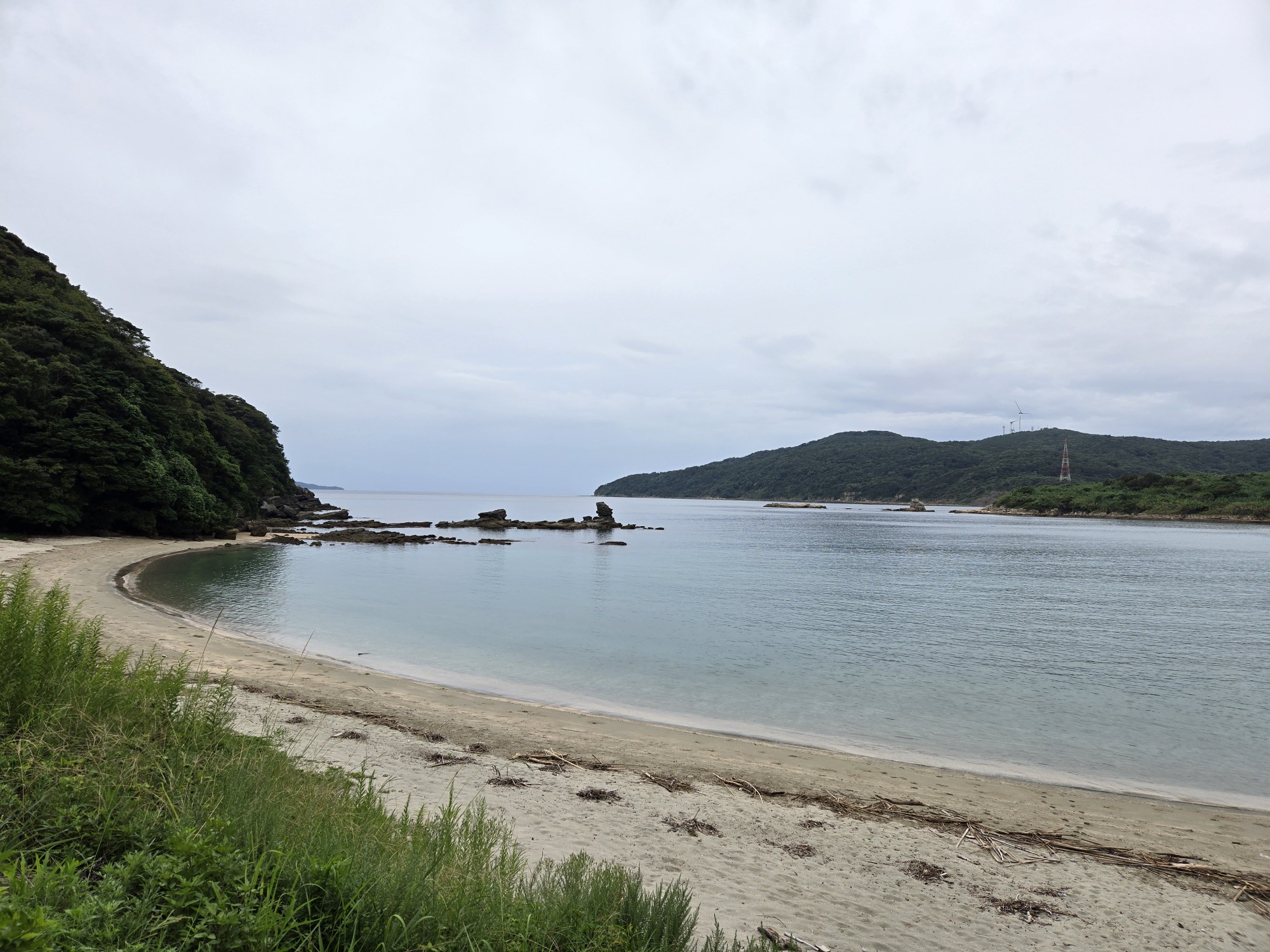 朝の天気予報では一時雨模様。現地に到着すると早速ポツポツと雨が!そしてなんと!ほぼ降り続く…。水温27℃であったかいはずなのに、気温24℃での雨天、陸であたたまらず3mmウェットではちと寒い…。うん、次回から5mmにしよう!!笑