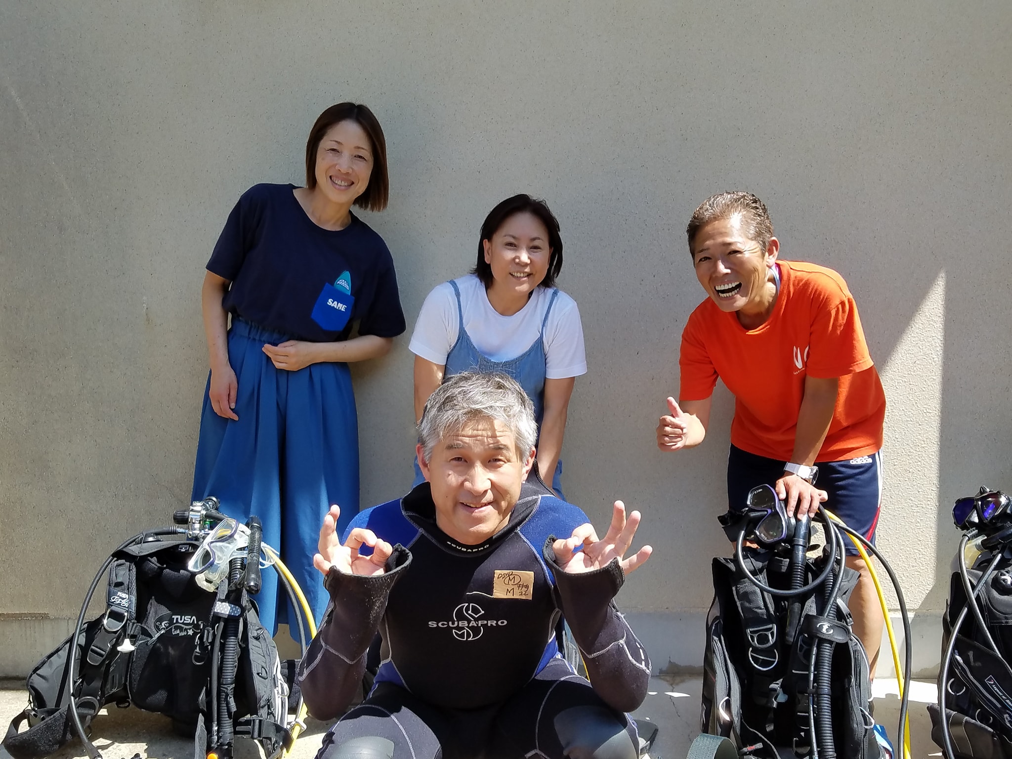 今回、こんなに海の状況が悪い中、皆さんよく頑張って下さいました。本当にお疲れ様でした。みなさんの楽しかったの一言で、私はその日の幸せを感じます。また今度は状況の良い時に体験ダイビングを!…って、あのー、ダイバーになりましょうよ。あちこちの海で、もっともっと楽しくて素敵な水中が待ってますよ。でも、海を年に1度でも楽しんで頂けたら、身近に感じて頂けたら、それが体験ダイビングでも嬉しい限りです。またお待ちしております!