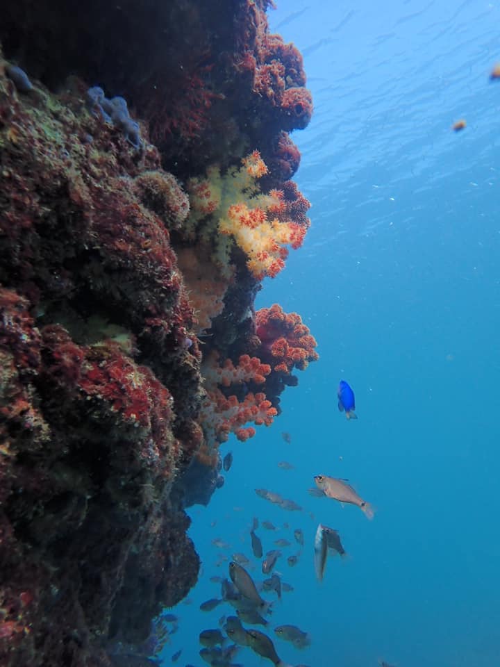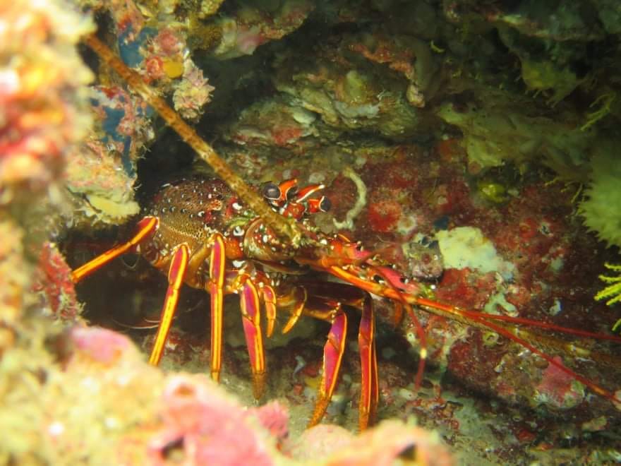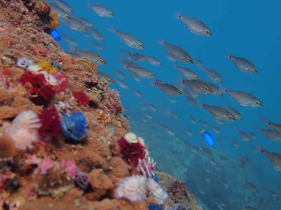強化トレーニングが終わったら長時間のファンダイビング!水中に光が注いでソフトコーラルが綺麗です。実はゴカイの仲間なのにやっぱり綺麗なイバラカンザシ、群れ群れ群れのクロホシイシモチ、おいおいお前のでっかい親はどこ行った?のチビ伊勢海老など楽しすぎて時間を忘れて遊んでおりました。