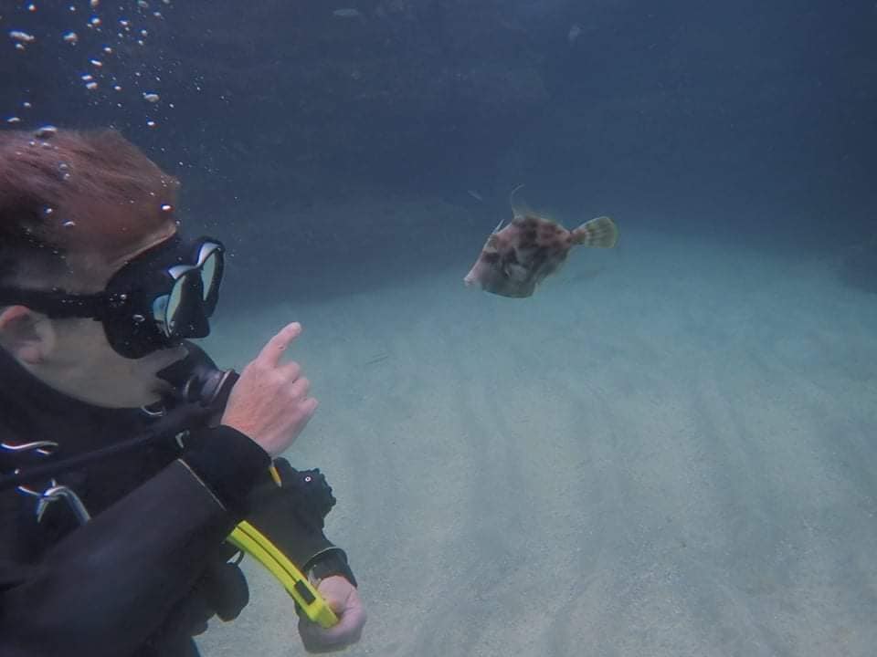 なつっこいカワハギがまたもや登場!一緒に講習を受けたかったようです(笑)。大きくなれよ~。釣られるなよ~!!