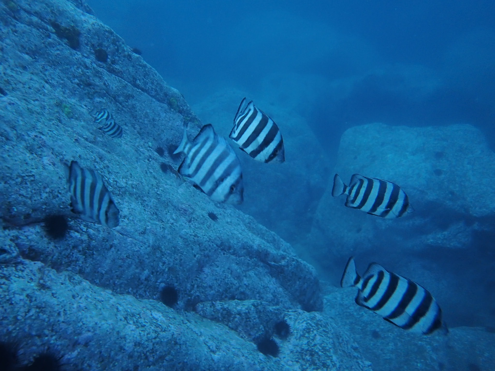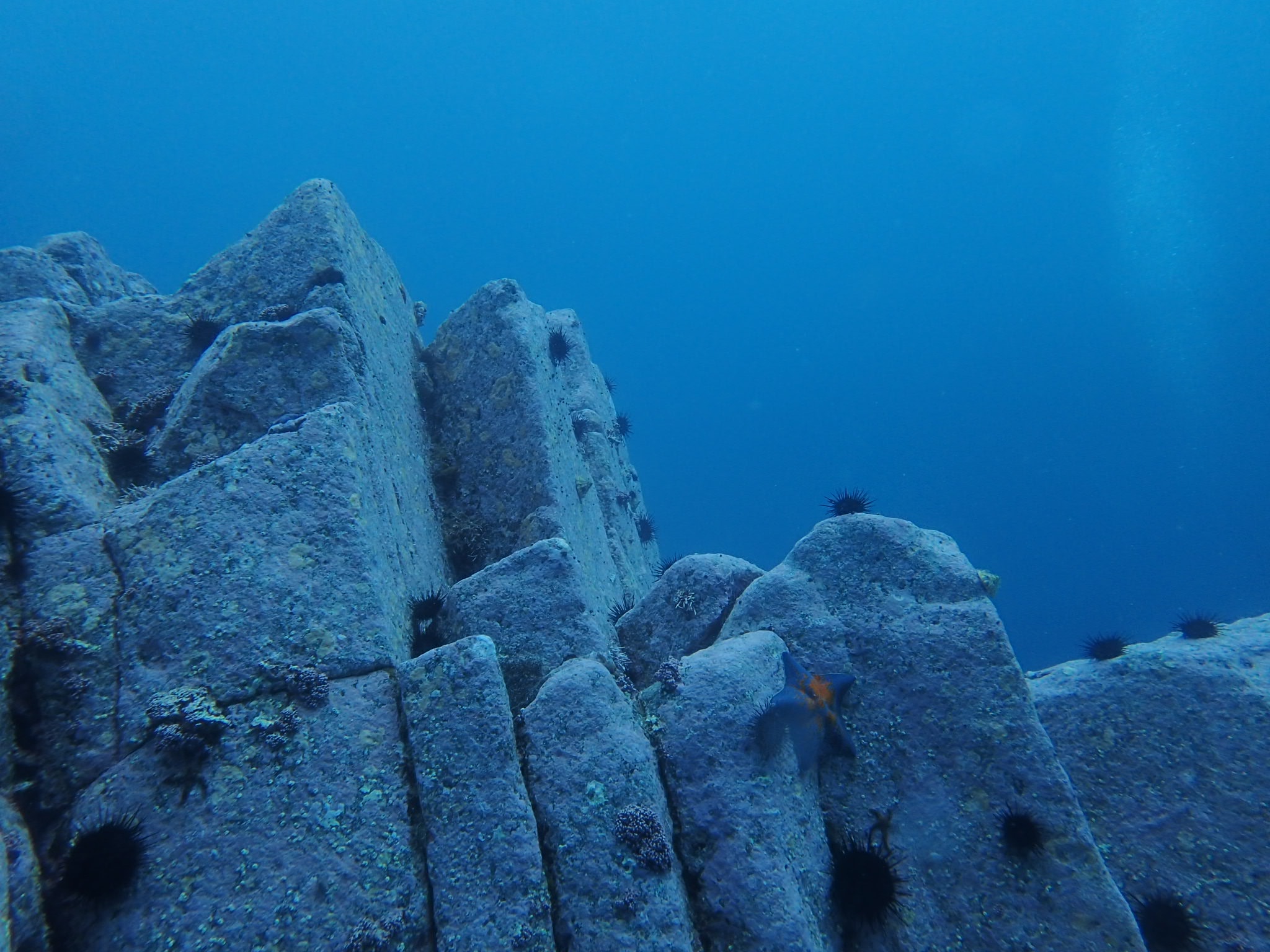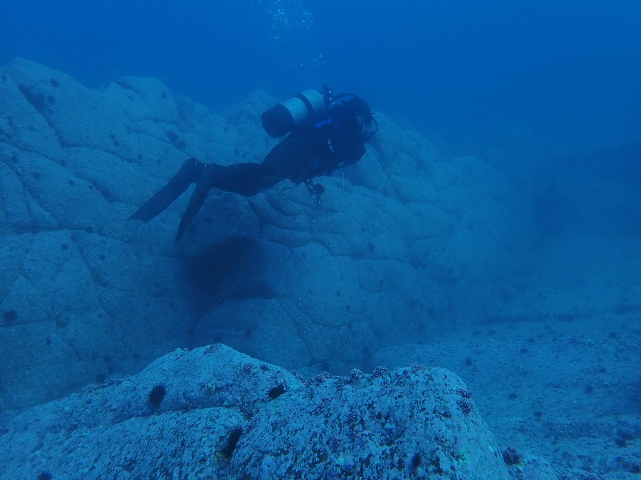 本当はタイトルの積丹の後に(神威岬)と入ったはず…。そう、神威岬には風と波で行けず、期待したマグロの群れやそれを追うホオジロザメに遭遇することは出来ませんでした。しかし、大好きな柱状節理のポイントで、真冬と違って全く寒くない心地よいダイビングを楽しんで来ました。