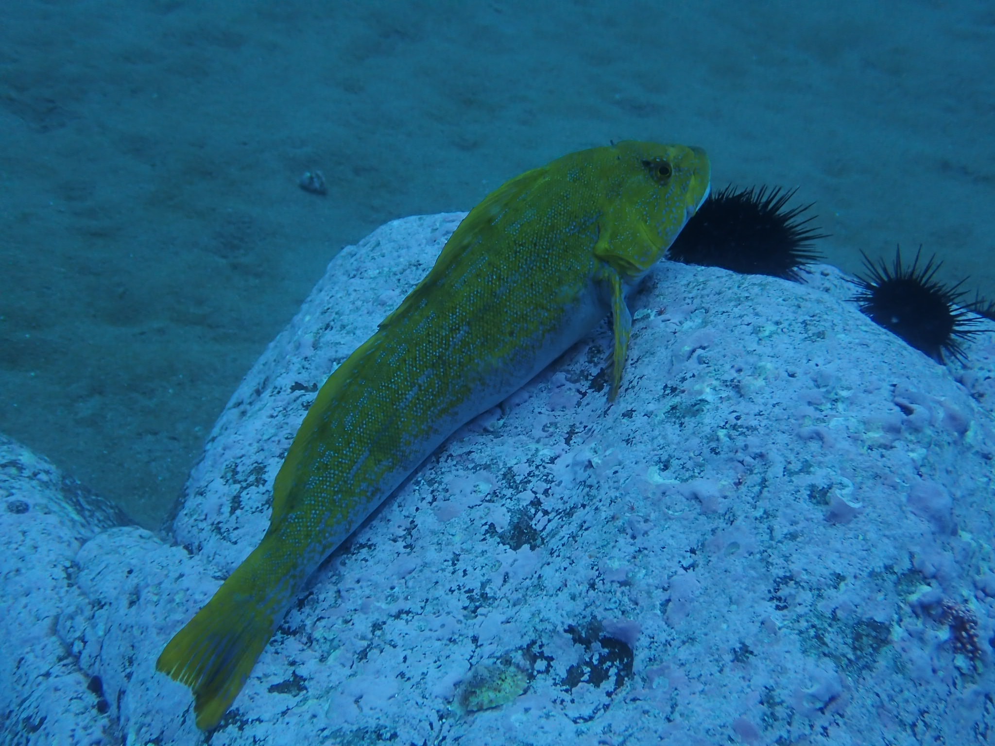 昨年末に積丹でご一緒した「ココナッツ本店」さんチームが到着し、いざ神威岬へ!!そう、年末にこれを約束しての再会でした。が、…神威岬へは風と波が強く無理でした(笑)。それどころかいつものマッカ岬にも行けず午前中は近くの白岩がやっとって感じ。しかし、水中はそれほど濁りがなく、イシダイの子供や婚姻色のアイナメなどが出迎えてくれました。水温21℃で積丹のこの時期にしてはあったか。透視度は14mってとこ。