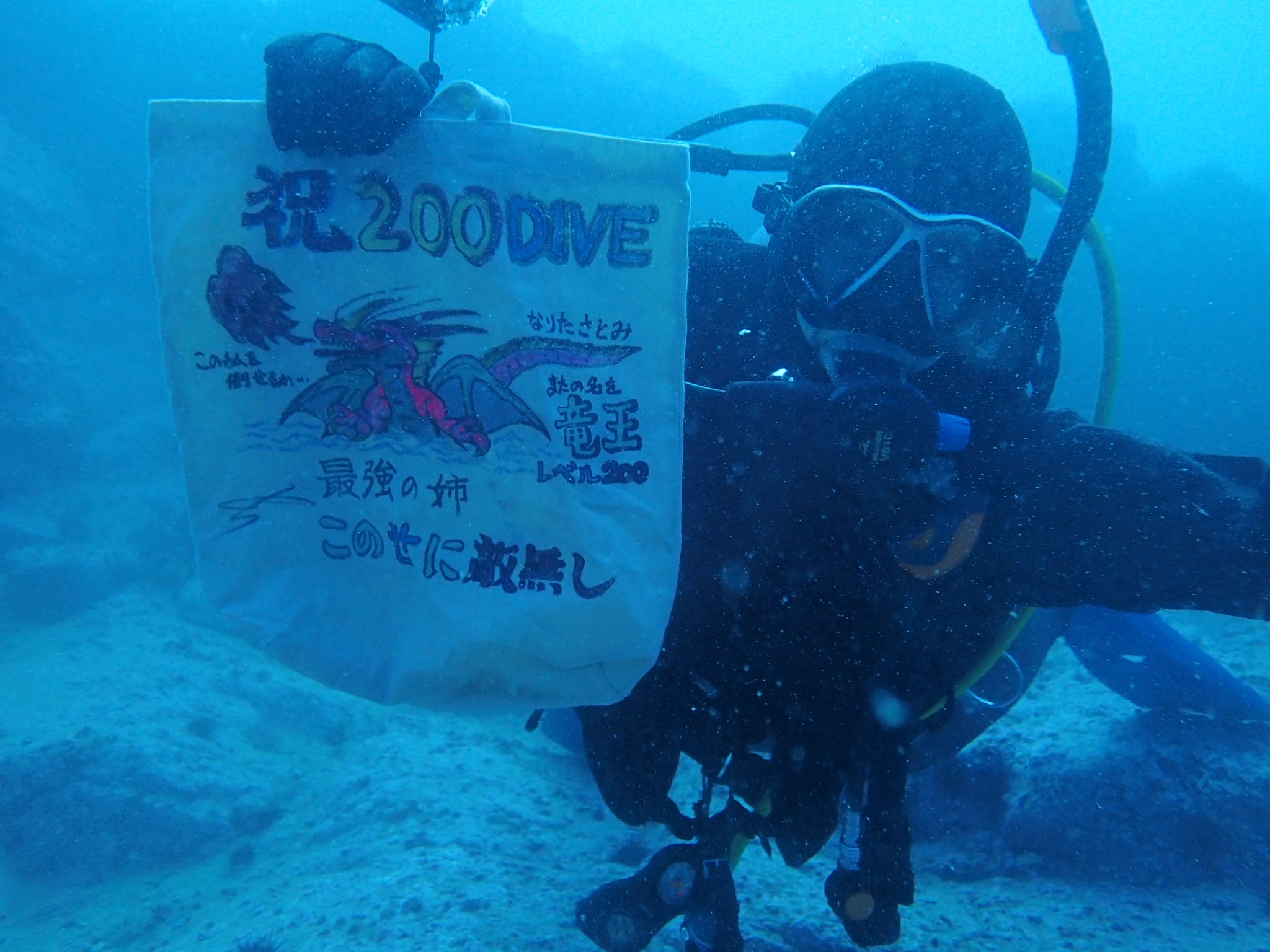 中竹軍団北海道組が到着し、社長特製のカレーを食べたあと、午後はあみだ岩でダイビング。ここも楽しいポイントで、自然にできた岩なのにまるで人工物のよう。岩の上はあみだくじのような岩のアートです。ここで、なりの200DIVE記念!!って言っても先日終わったらしいですが(笑)。本当は伊江島で迎える予定でした。私が記念にと作成し伊江島で渡しておいたトートバッグが出現!そしてそれを落としていくなり…。もう記念品はやめた(笑)。拾ってくれたS子ちゃんありがとう!