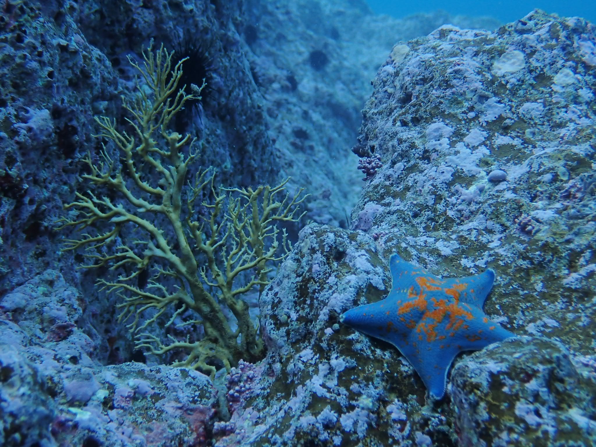 よし!行けそうだ!!とボートは早朝から神威岬を目指したものの、何だ?予報と違う風向き…。行けない…。引き返してマッカ岬へ。人間も水中生物もまだ寝ぼけ眼?そりゃそうだ。ダイビング開始が06:40という…(笑)。その後、一旦ショップへ帰りましたが海の状況変わらずで、ジャイアントステップ~キャニオンのドリフトDIVEへ。柱状節理の岩がなんとも見事です。私の大好きなポイントへ行けたので幸せでした。